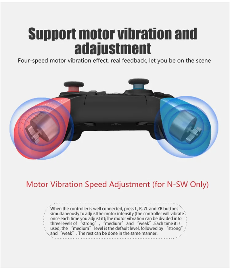 - DUAL VIBRATION MOTORS and SCREENSHOT: Like the official Switch controller, this device allows you to take screenshots for sharing on social media. Dual vibration motors provide four levels of precise feedback: none, weak, medium, and strong, compatible with games like Mario Kart 8 Deluxe, Sonic, The Legend of Zelda, Super Odyssey, and Splatoon 2, among others (supports the latest console version).